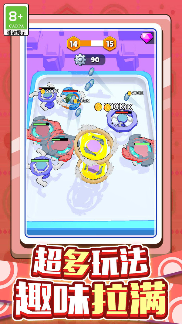 3、每个关卡设有特定目标,如在限定时间内合成指定等级陀螺,或让陀螺保持旋转达到一定时长,挑战性逐步提升。